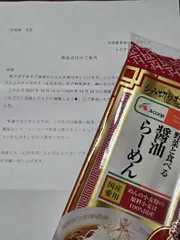 うちにも! 買い物から帰宅すると、夫が「全農からなんかきとるぞ」と言うから、テーブルの上を見ると、なんか大きな封筒。手に取ると、なんかモニャモニャしてる。なんだろう?と思いながら開けると、そこにはプチプチで包まれたラーメン!ん?と思いながら同封されていたお知らせを見ると、『しりとり』への参加賞!プレゼントを、い