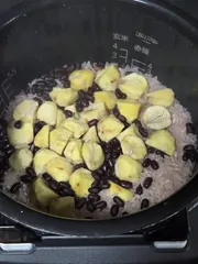 さっそく🌰 『おかわり』へのランクアップでいただいた『炊飯器で赤飯おこわ』さっそく栗🌰を入れて作りました!この赤飯おこわ、材料を炊飯器の鍋に入れるだけなので、とってもカンタン!しかもおいしい!ありがとうございました!