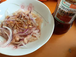 玉ねぎがたまに辛いのもあり、今回は水にさらしてから水切りした玉ねぎにドレッシングを和えておきました。後からツナもトッピングして美味しくいただきました😊このこだわりドレッシング美味しいですね!