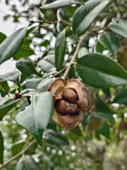 椿の種(実🫒)  冬〜春に咲いた椿に 実がなります👀 え?これなんだったかな? と隣を見ると わじけて 中に種が☺️ 栗が熟すると パカッと割れて栗の実がおちますが… 椿も落ちます。 何十年ぶりに見ました。  明治生まれの祖母は 生涯髪を短くせずに 1つに