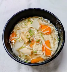 昼食が遅かったので 夕食は簡単素麺汁に😄あげ 大根 人参🥕 冷凍しいたけ🍄🟫 えのき ネギ 🎶 味付けは Aコープみりん調味料と薄口醤油のみ☺️ 仕上げに素麺を入れて サッと煮るだけ🎽 おわんに入れてる時間で直ぐに 柔らかくなってしまいます😅 アッサリと頂きます🙂