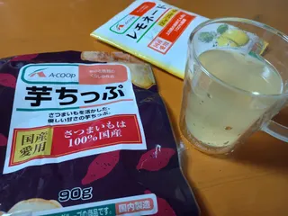 美味しいレモネード… このレモネード、広島県のよくあるお土産のやつと一緒かな?お値段や量的にも。寒くなってきたのでホットで甘いレモネードはカラダニシミル〜芋ちっぷは、チャック入りません🤭
